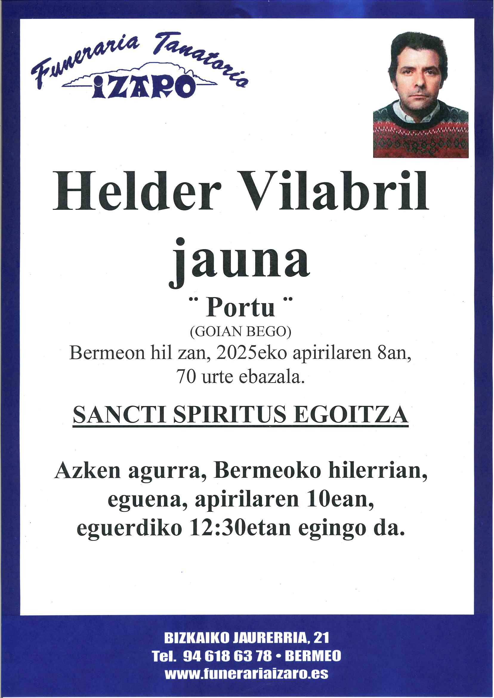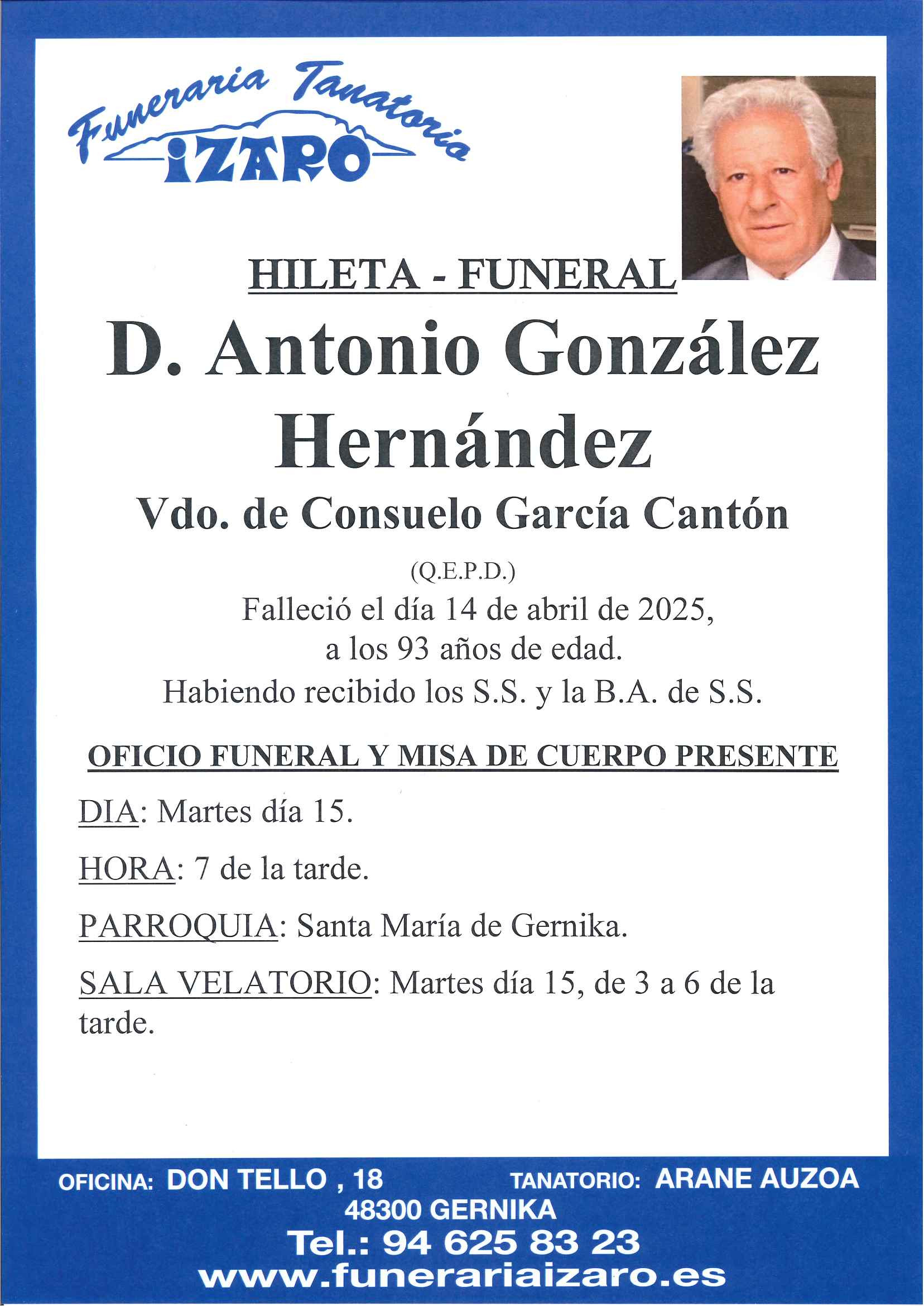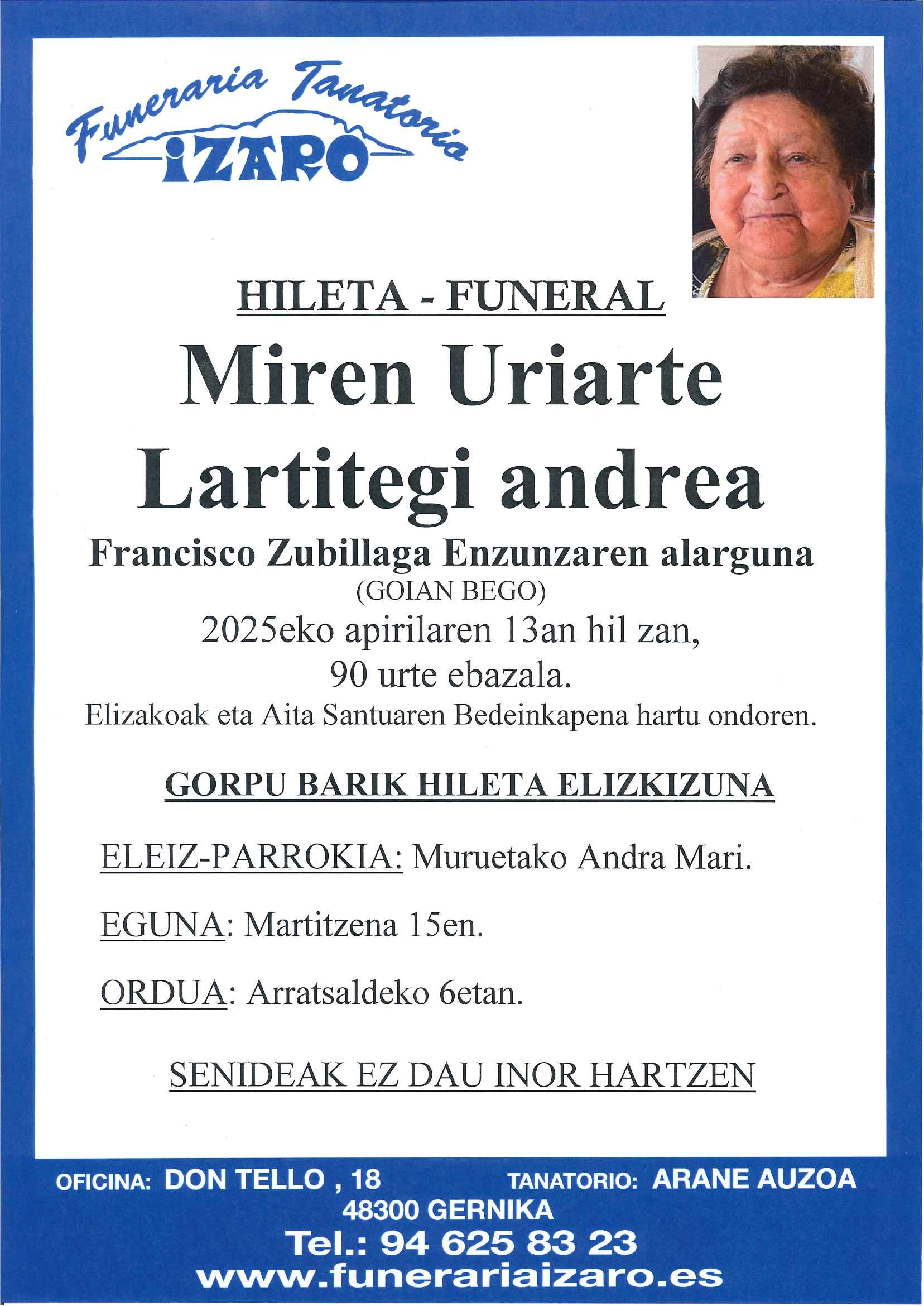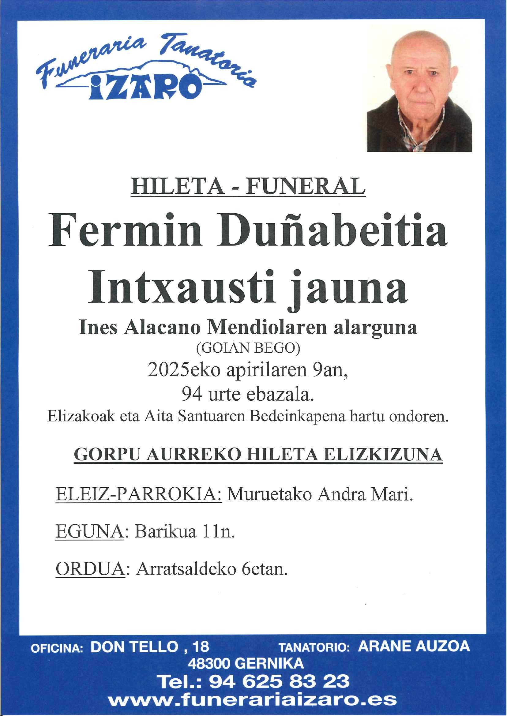 Gorpu barik hileta elizkizuna, astelehena 7an, arratsaldeko 6etan, Gernikako Frantzisko Deuna eleiz parrokian.